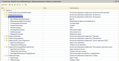 На втором уровне вводятся элементы – виды контактной информации, список которых определяет разработчик конфигурации.