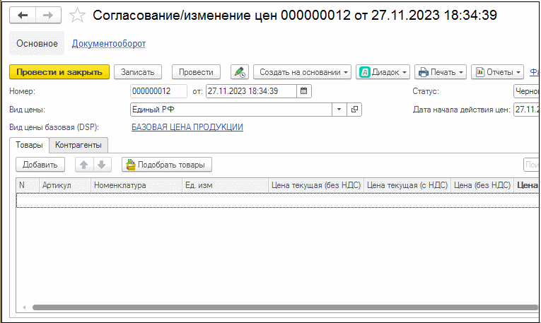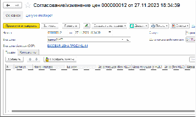 После того, как документ получил все визы согласования, в ERP изначальный документ меняет свой статус на «Согласован» и после этого возможна дальнейшая работа по установке цен номенклатуры.