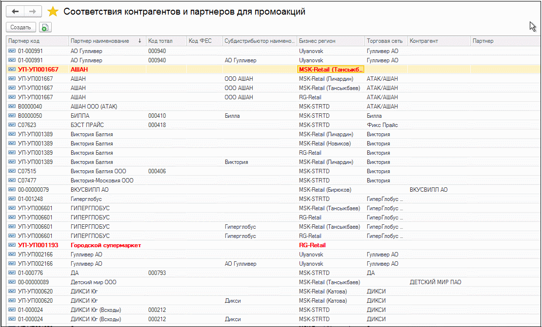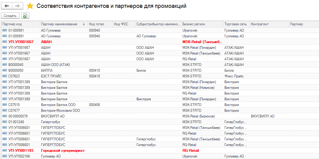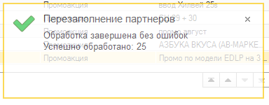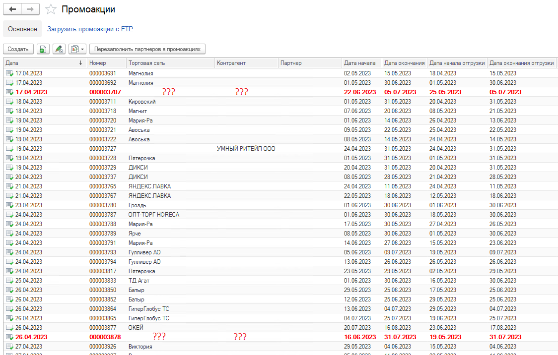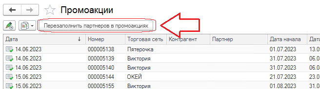 Теперь можно будет перезаполнить непривязанные «красные» промоакции. Для этого нажмите кнопку «Перезаполнить партнеров в промоакциях» в верхней части списка документов промоакций