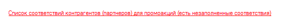 Если есть проблемы сопоставления, т.е. не указаны какие торговые сети и контрагенты в ERP соответствуют клиентам в базе PO, то в нижней чести списка документов промоакций присутствует ссылка красного цвета